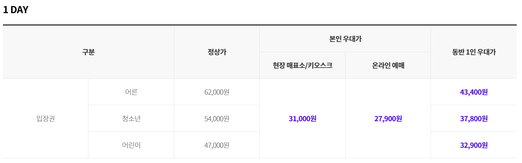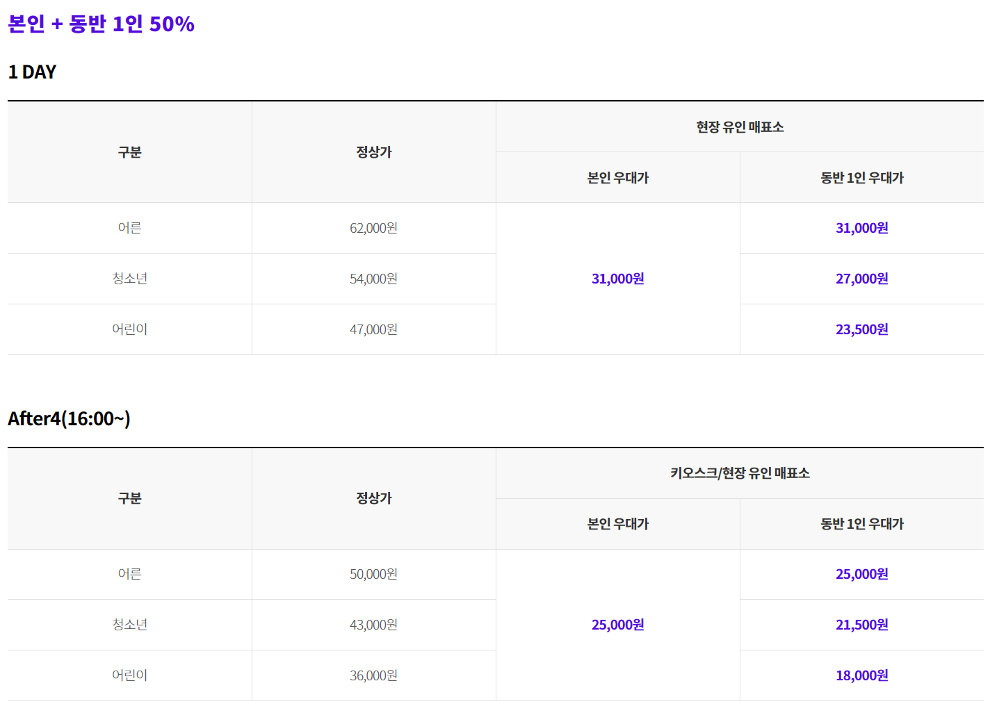 - 내용 : 종합이용권/파크이용권 50% 우대