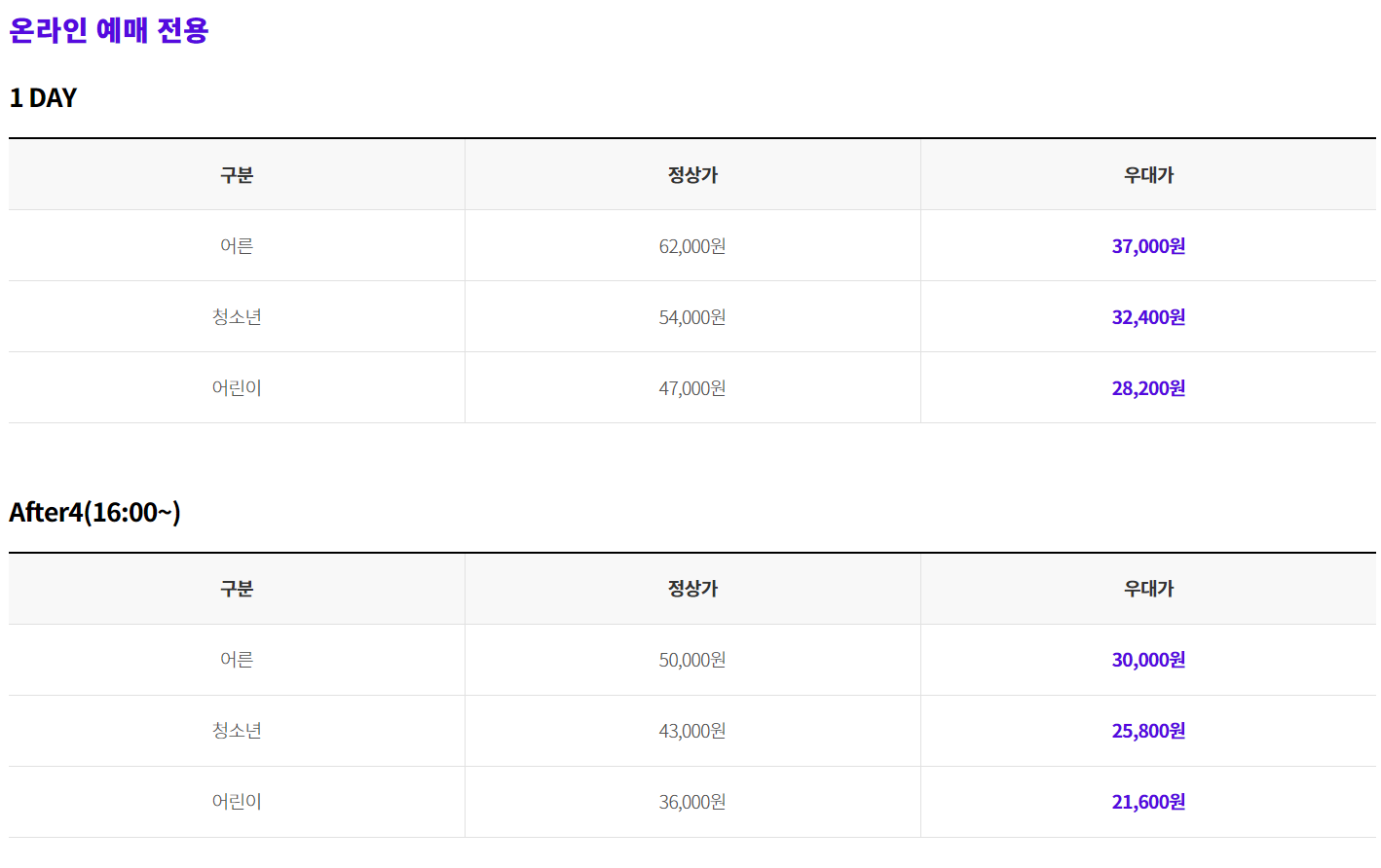 | 어른 | 62,000원 | 50,000원 | 59,000원 | 47,000원 |