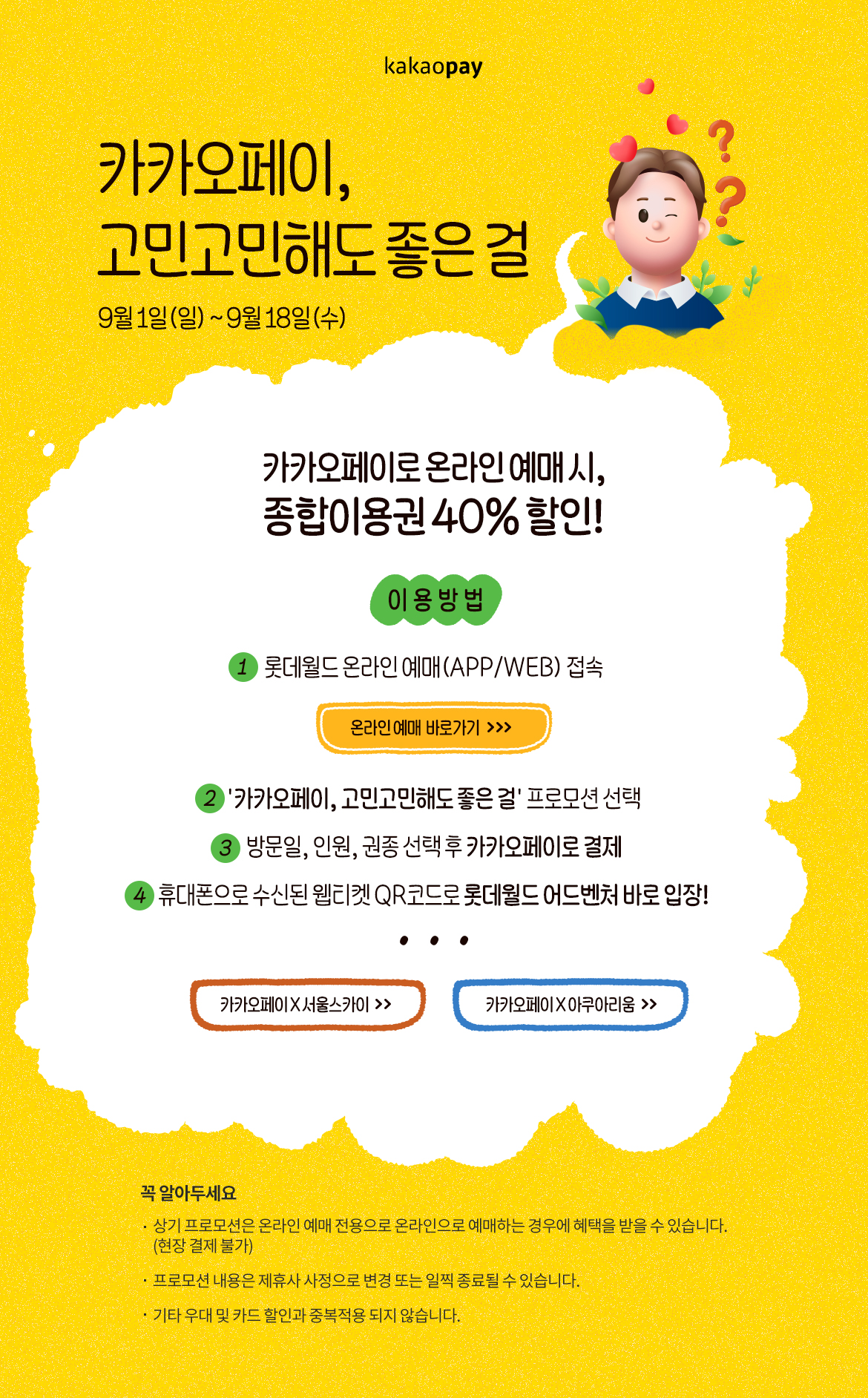 아래 버튼으로 롯데월드 온라인 예매에 접속하시고 '카카오페이 고민고민해도 좋은 걸' 프로모션 선택하셔서 주문하시면 됩니다.