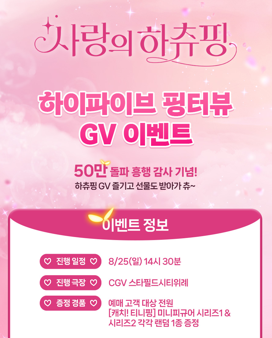 CGV 홈페이지 들어가셔서 하츄핑 고르실 때, 옆에 열리는 하이파이브 핑터뷰를 누르셔야 해요! 현재 기준 161석이나 남아있으니 좋은 기회 놓치지 말고 얼른 잡으세요!
