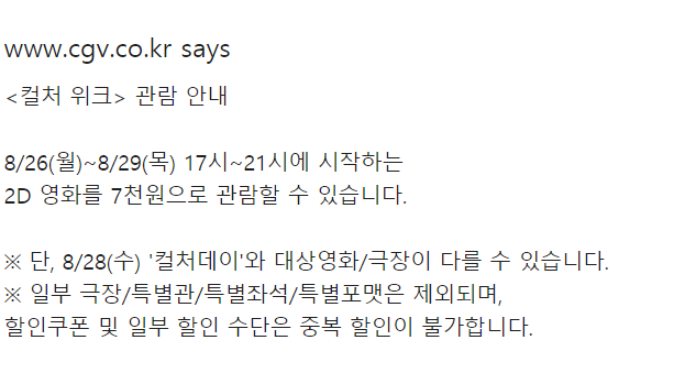 ※ 2D 일반 상영관에만 적용, 조조/우대/이코노미 석에는 할인 적용 불가