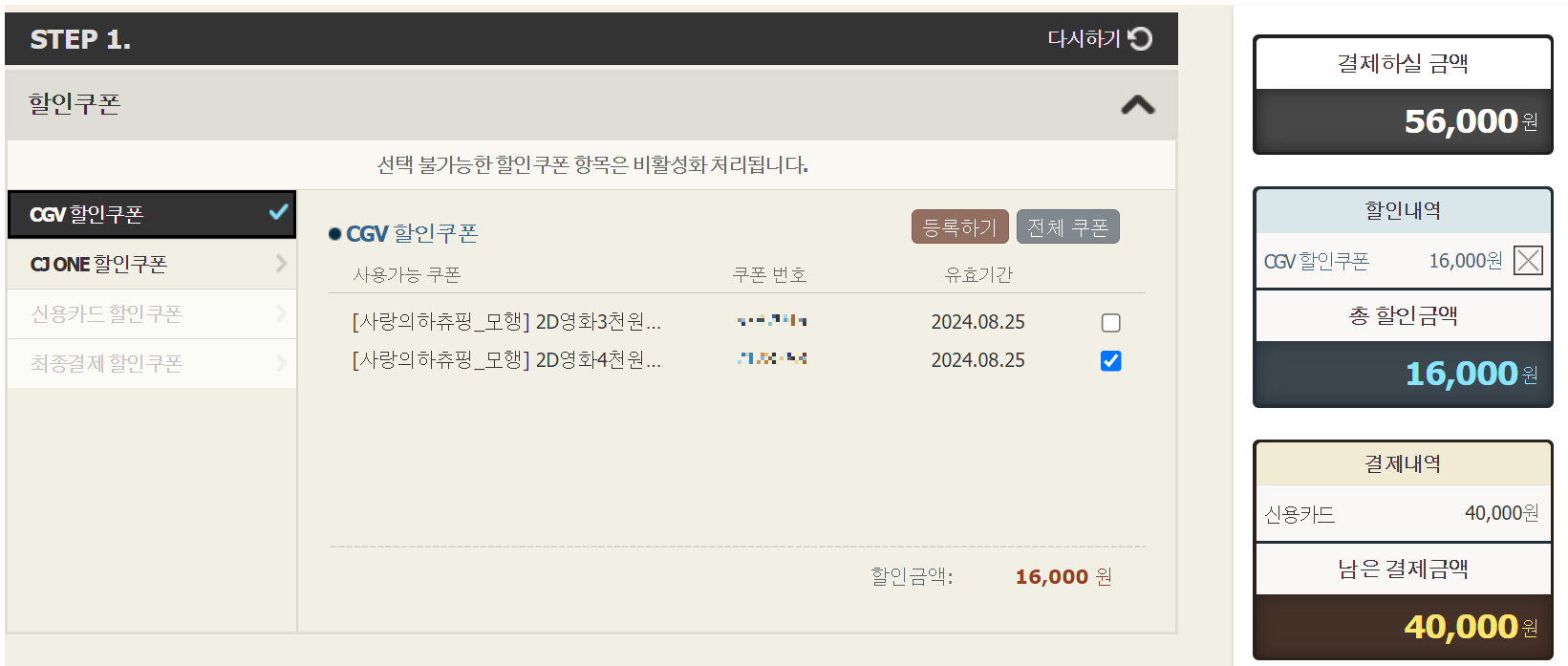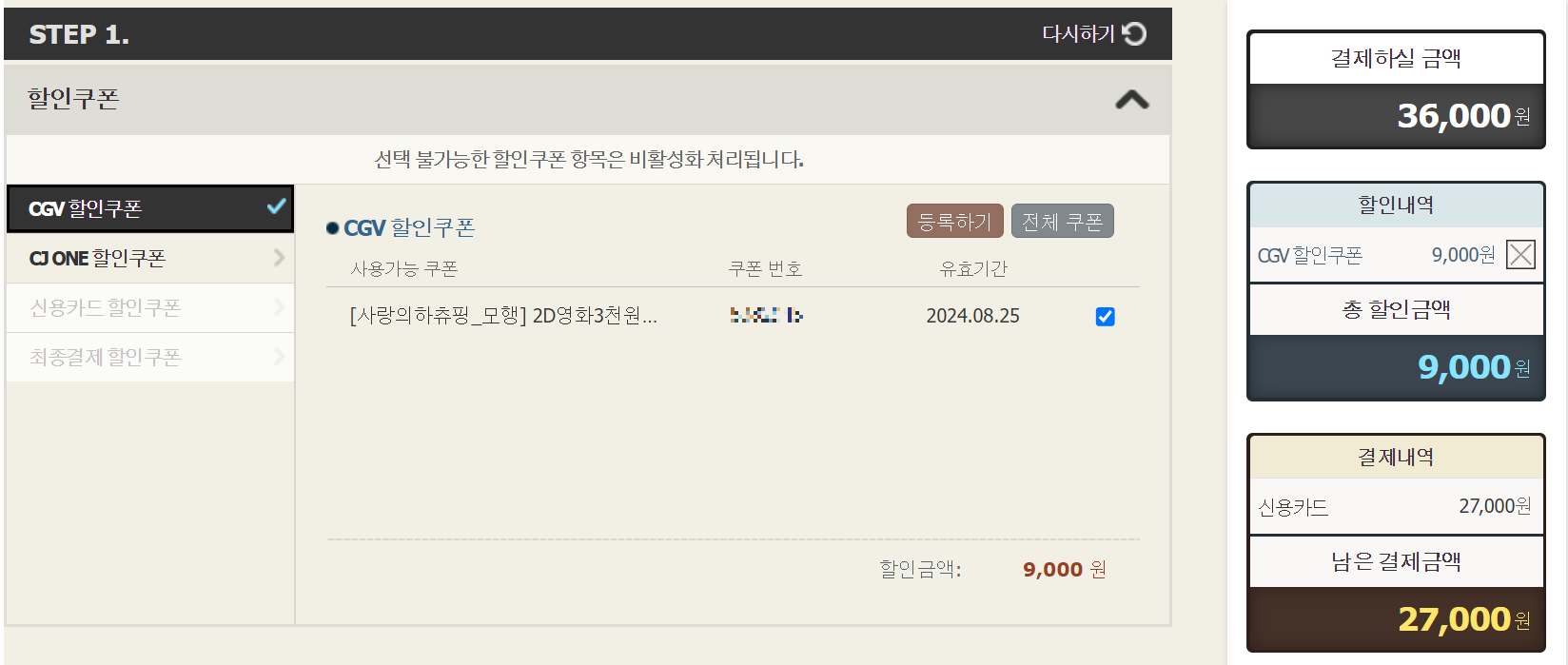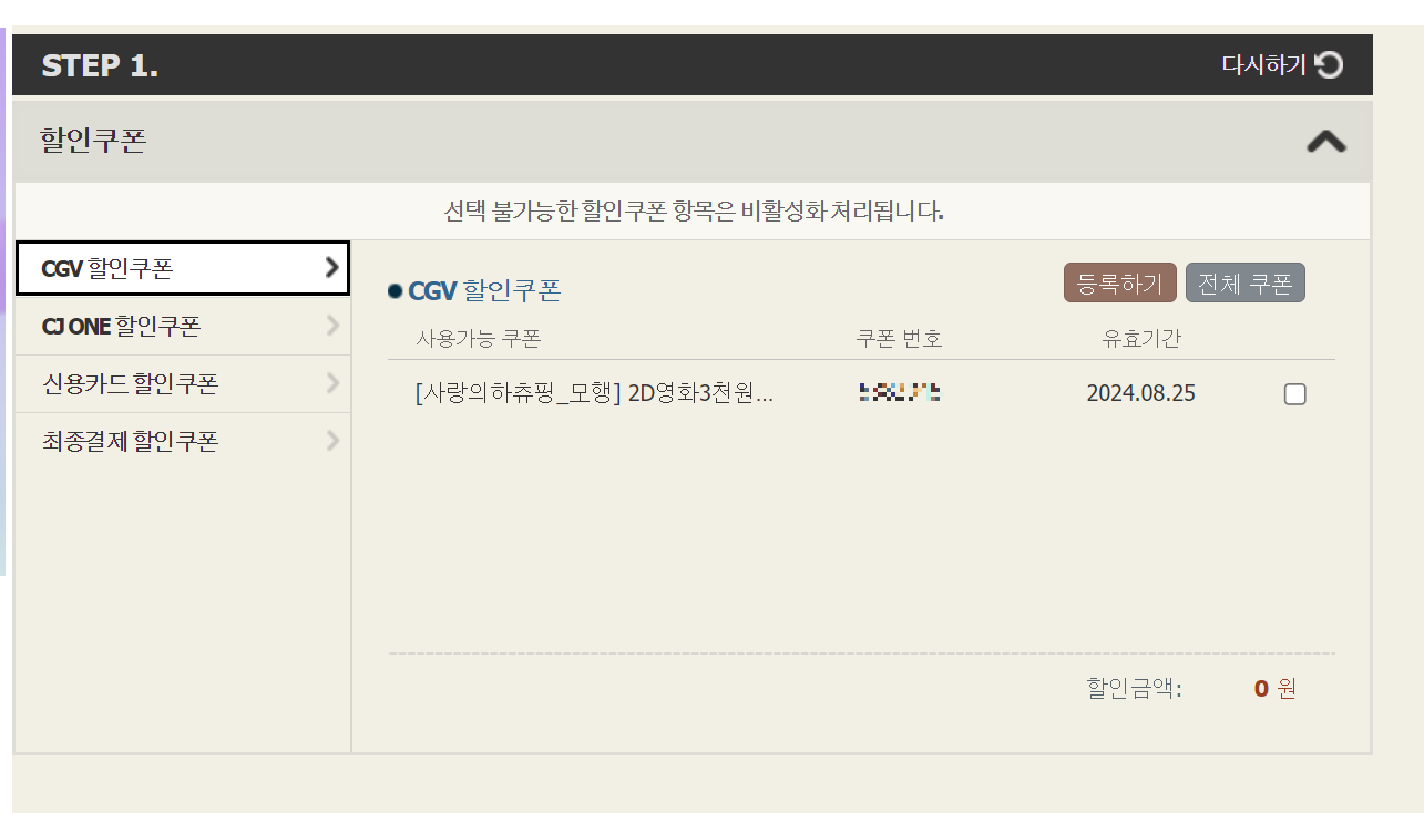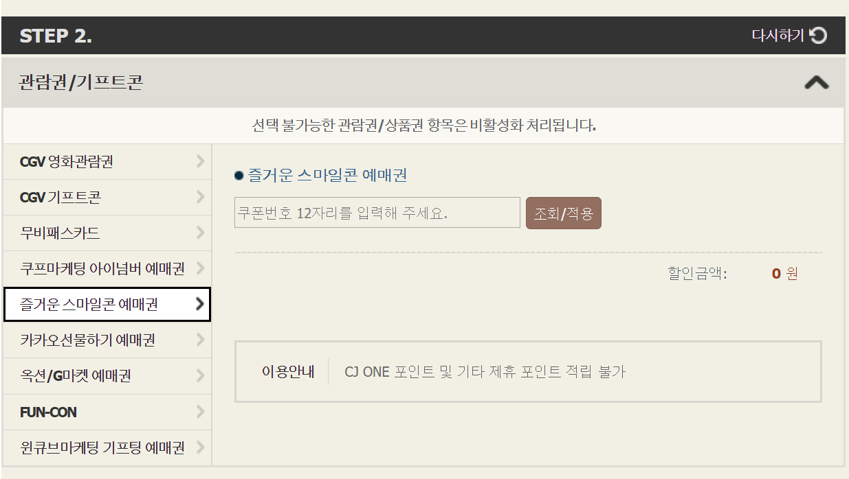 3. 결제단계에서 STEP 2. 관람권/기프트콘 선택