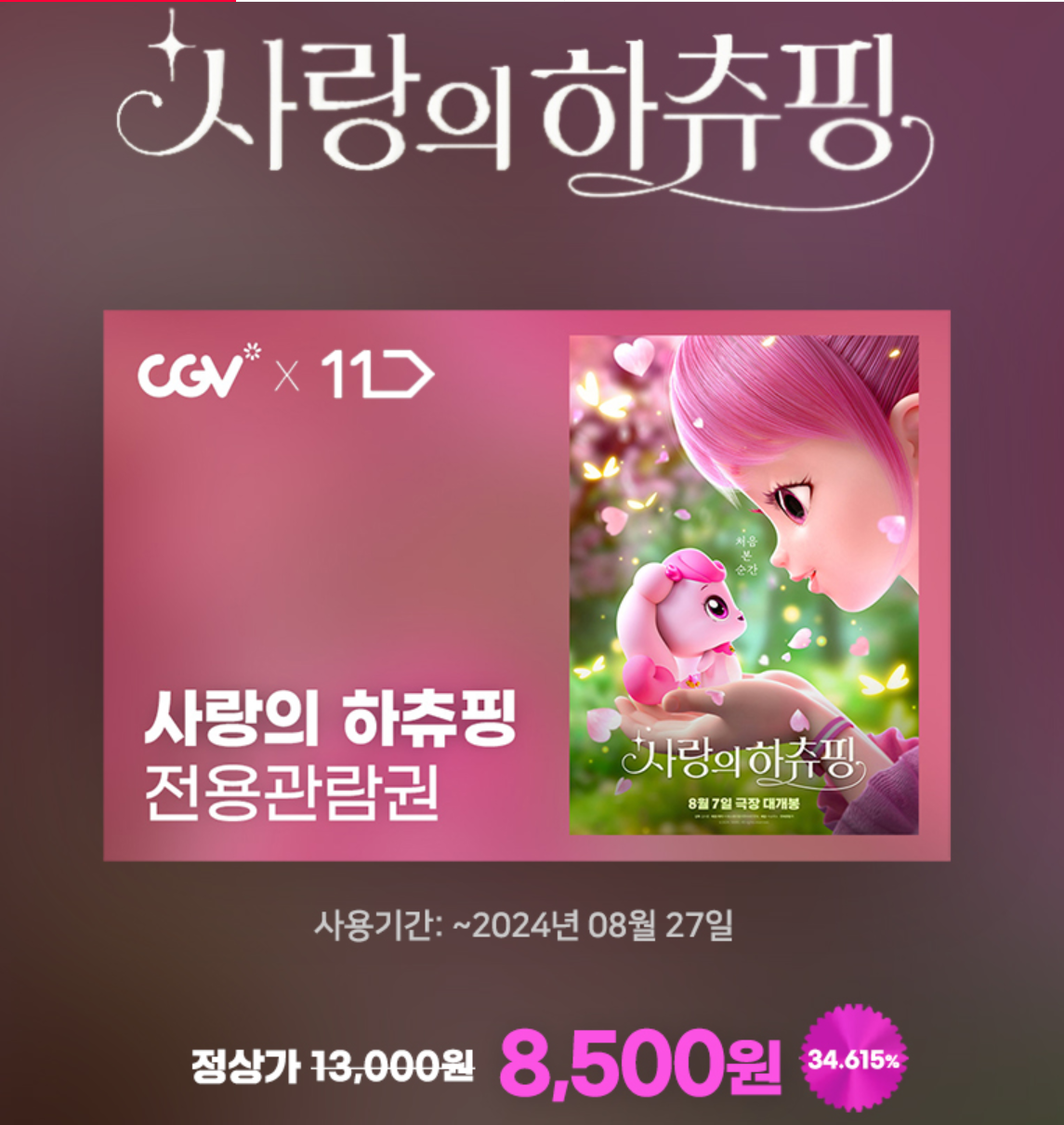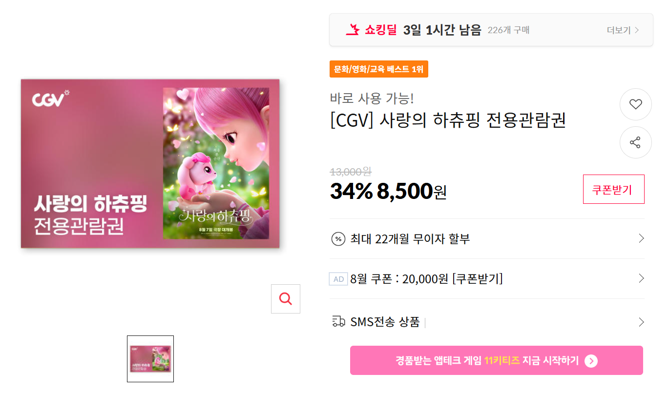 사랑의 하츄핑이 이제 끝물인가 봅니다.CGV에서 저렴하게 볼 수 있는 방법들이 있네요.
