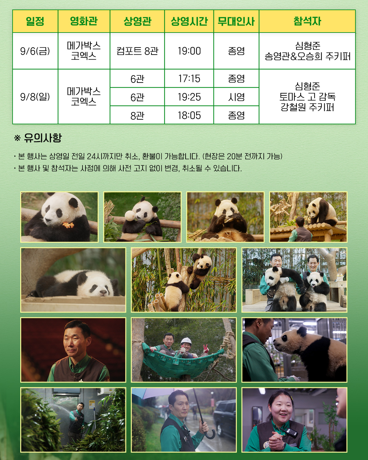 안녕 할부지 주키퍼 님들과의 대화를 할 수 있는 GV 시사회 및 주키퍼 님들과 인사 할 수 있는 무대인사 일정을 공유드릴게요. 영상 속 푸바오 뿐 만 아니라, 주키퍼 님들까지 실제로 만나볼 수 있는 기회! 놓치지 마세요!
