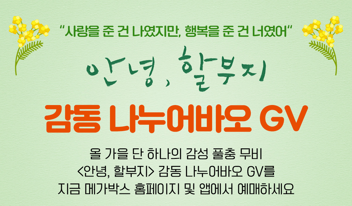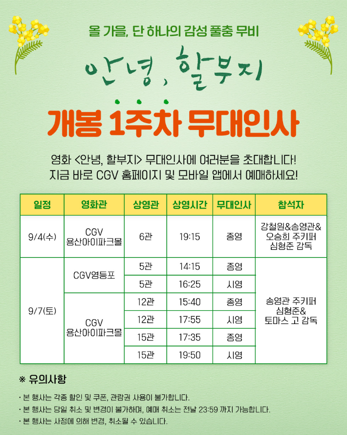 안녕 할부지 GV는 거의 매진이라 취소표 기다려보셔야 할 것 같구요, 안녕 할부지 무대인사도 빠른 속도로 표가 나가고 있으니 얼른 예매하러 달려가세요!