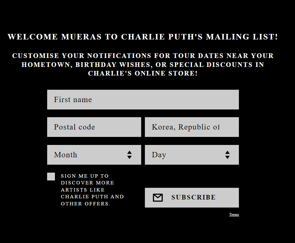 이름/우편번호/국가/생일을 입력하고 subscribe를 눌러줍니다. 체크박스는 해제하셔도 되어요.