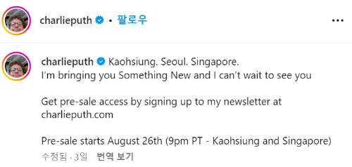 찰리 푸스의 인스타그램에 콘서트 소식이 올라왔어요. 12.5 대만 가오슝, 12.7 서울, 12.10 싱가포르에서 공연을 할 모양입니다!! 가오슝과 싱가포르 공연은 8. 26, 10시에 프리세일이 예정되어있네요. 싱가포르 공연보다 날짜가 더 빠른 한국 공연이 아직 예매가 안 열렸는데, 조만간 열리지 싶습니다.