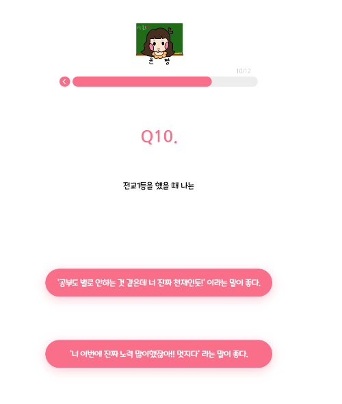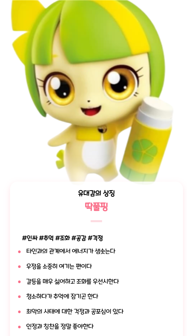 질문 개수가 한정적이고, 캐치 티니핑의 성격들을 다 알고 있지 못하다 보니 저는 정확성을 잘 모르겠는 테스트이긴 합니다. 하지만 티니핑 좋아하는 친구들이라면 좋아할 것 같아요! 자기는 무슨 핑 나왔고, 엄마는 무슨 핑 나왔는지, 친구는 뭐 나올지 같이 얘기하는 시간 가져봐도 재밌겠네요.